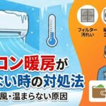 エラーコードが出ていても、実際の困りごとは「暖房が効かない」「冷えない」「すぐ止まる」といった症状ベースで考えたほうがわかりやすいことがあります。暖房トラブルが中心なら、暖房が効かない時の対処法もあわせてご覧ください。