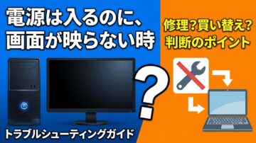 電源は入るのに画面が映らないときの判断ガイド|修理か買い替えかを見極める 電源ランプは点く、ファンも回っている。それでも画面が真っ暗なままだと、「もう買い替えしかないのでは」と不安になりますよね。ですが、この症状は液晶やケーブル、表示出力の問題で直ることもあれば、GPU(映像を処理する部品)や基板など本体側の故障が関係していることもあります。 最初に何を確認すればよいかがわかる 液晶故障と本体故障… -