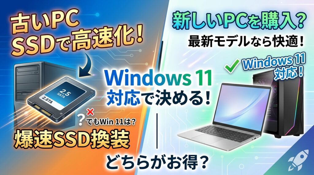 結論だけ先に言うと、軽作業中心でWindows 11に正式対応しているPCならSSD換装、非対応や高年式のPCなら買い替えを優先するのが基本です。